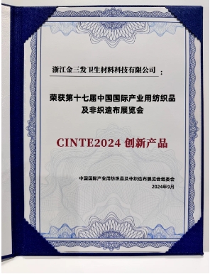 Zhejiang Kingsafe Sanitary Material Technology Co., Ltd.:n toimittama "Green Super Soft Sandwich Spunlace Nonwoven" voitti vihreän kehityksen innovaatiotuotteen.